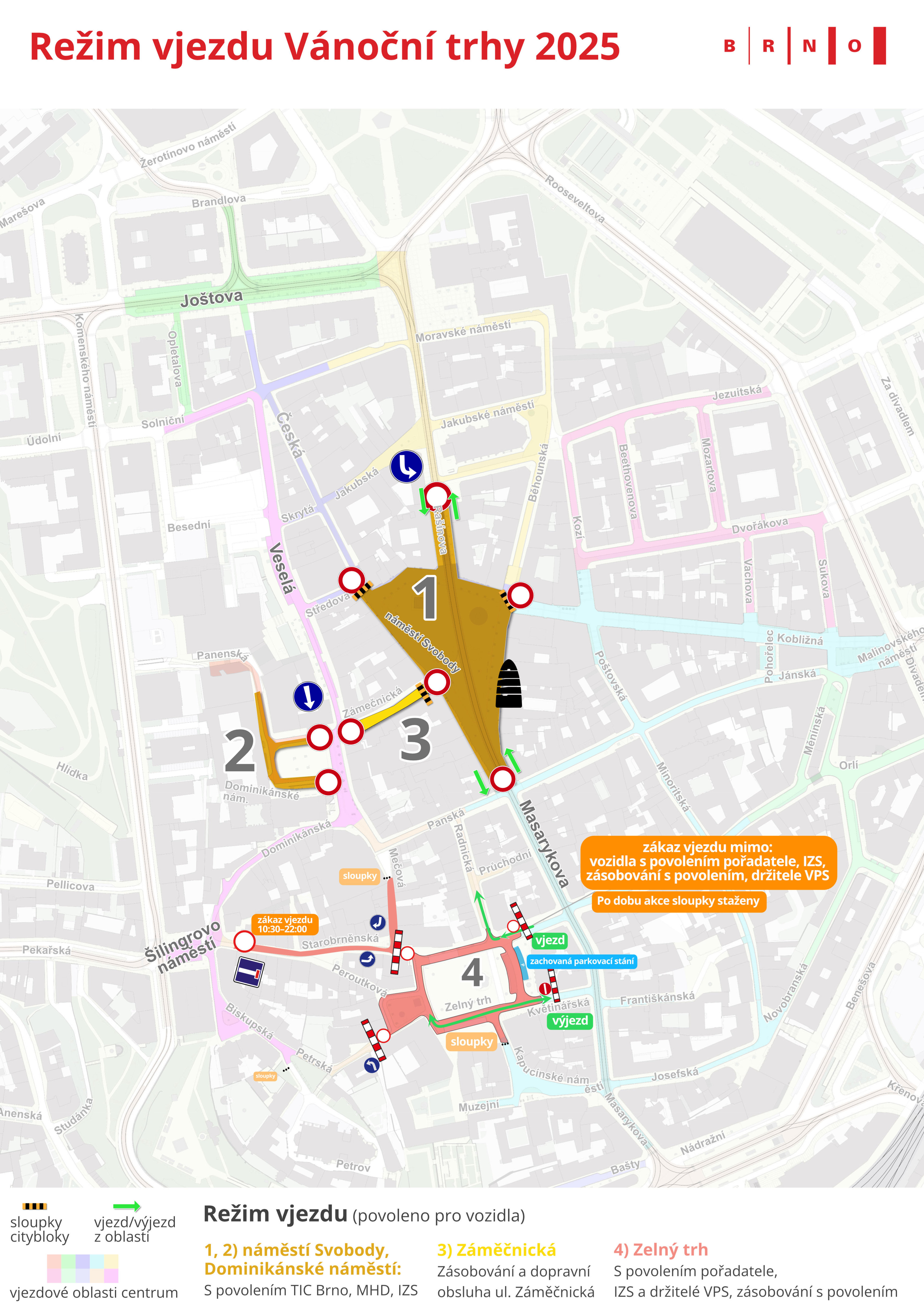 Na mapě níže najdete režim vjezdů v období vánočních trhů v historickém centru. Možný vjezd/výjezd je znázorněn zelenými šipkami. Z důvodu uzavření ulic, kterými bylo možné vjet do podoblasti Zelný trh, je možné do této podoblasti vjet Masarykovou ulicí.