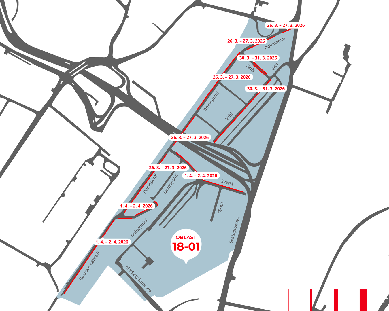 Systém rezidentního parkování se od 27. dubna 2026 rozšíří do oblasti 18-01 (Dolnopolní). Realizace dopravního značení bude probíhat od konce března v ulicích jako Vrbí, Sady, Dolnopolní Baarovo nábřeží a Světlá. Prosíme, sledujte dopravní značení a respektujte dočasný zákaz parkování. Urychlí nám to práci, vyhnete se pokutě a ulice tak bude připravena dříve. Děkujeme.