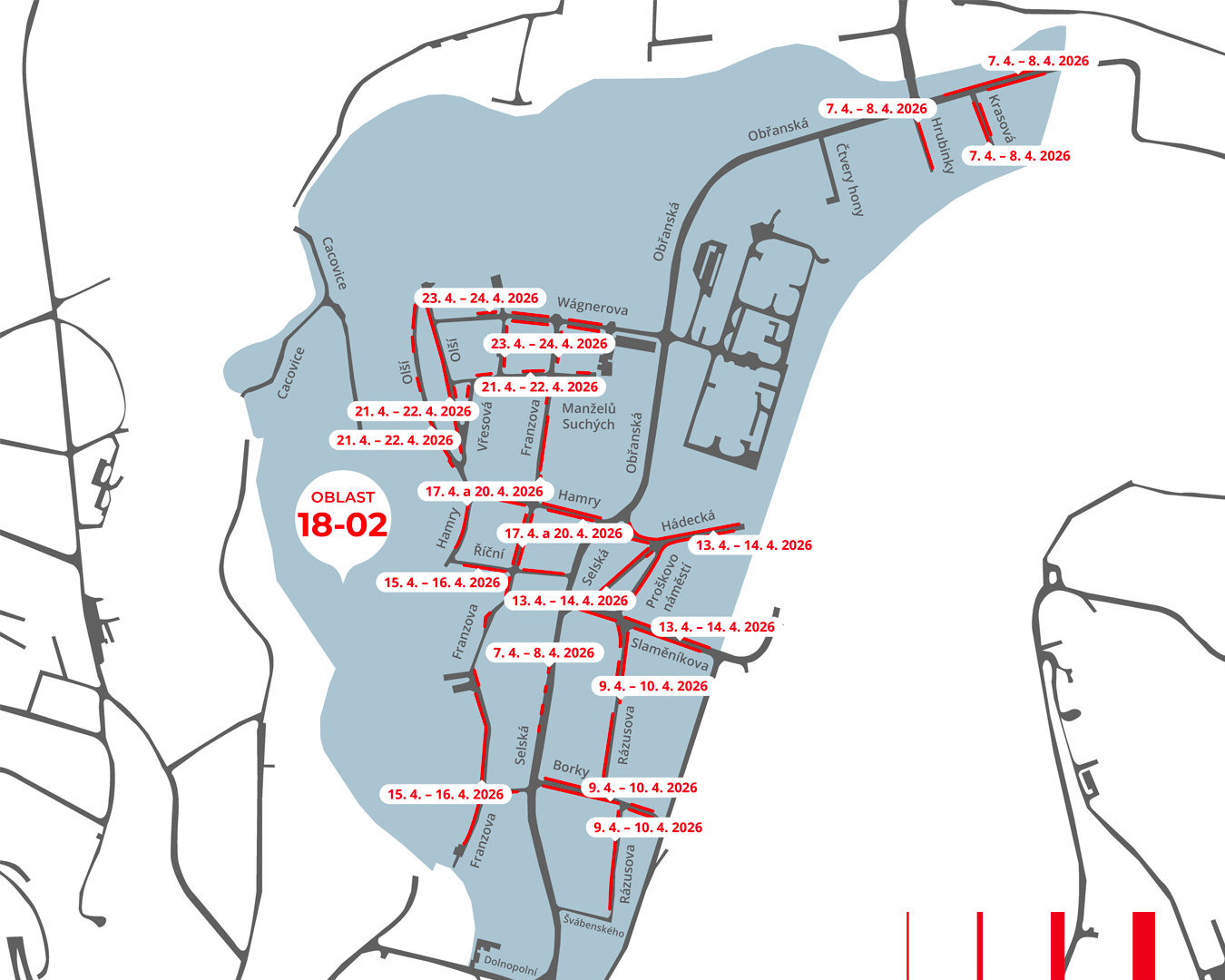 Systém rezidentního parkování se od 27. dubna 2026 rozšíří do oblasti 18-02 (Obřanská). Realizace dopravního značení bude probíhat v průběhu dubna v ulicích jako Hamry, Franzova, Borky nebo Olší. Prosíme, sledujte dopravní značení a respektujte dočasný zákaz parkování. Urychlí nám to práci, vyhnete se pokutě a ulice tak bude připravena dříve. Děkujeme.